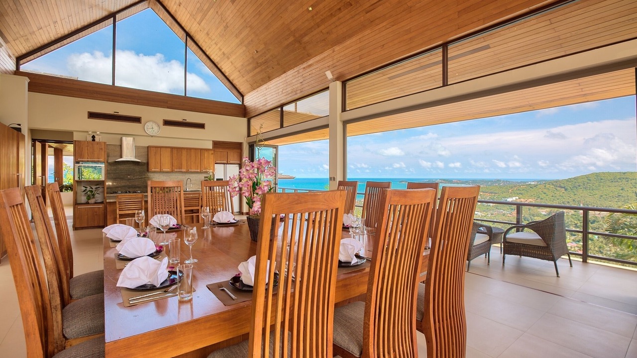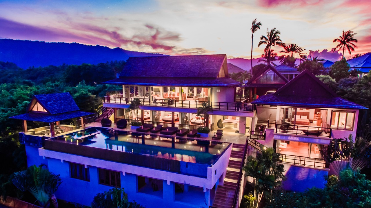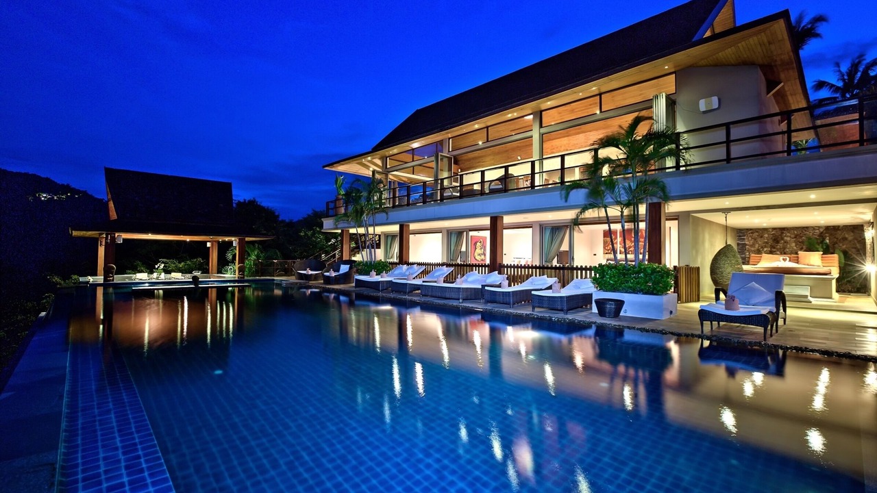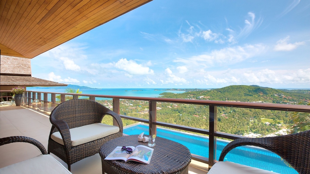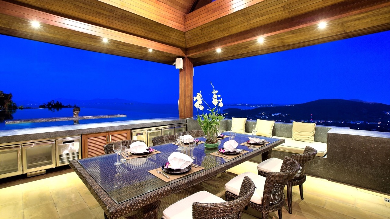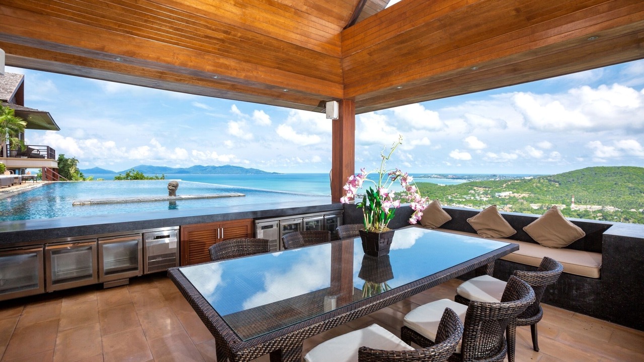 This lavish 5 bedroom villa is located high in the hills of Bo Phut, affording its guests a high quality and stylish standard of living along with exquisite panoramic sea views.