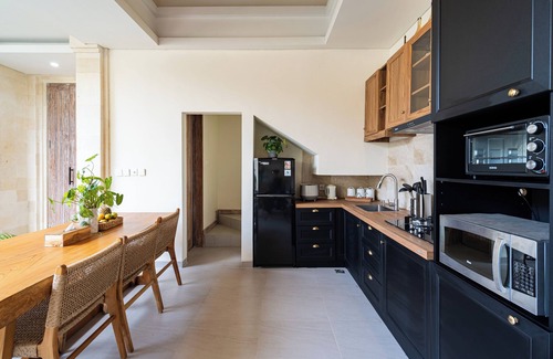 Inside, the fully equipped kitchen invites you to indulge in culinary creations, while the open-plan living area seamlessly blends traditional Balinese charm with contemporary elegance, offering an ideal setting for relaxation and socializing.