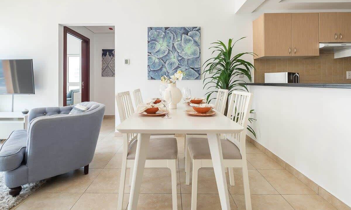 • For those who enjoy cooking or dining in, the fully-equipped kitchen is perfect for preparing meals with ease. The elegant dining area provides a great spot for enjoying those meals, and the apartment's design creates a sense of flow, making it feel spacious yet comfortable.