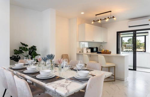 Enjoy a private pool, a fully equipped kitchen, and charming British-inspired decor.