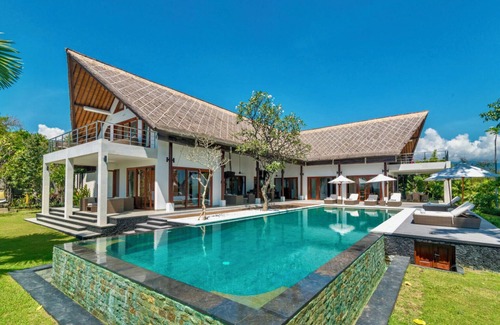 The generously spaced villa offers 700sq. metres of living space covered with traditional Alang-Alang roof. It is designed in a unique combination of modern and traditional Balinese architectural elements. The property offers the best of Balinese hospitality with European standards through luxury, refinement, modernity, design, space and comfort. In 5 air-conditioned bedrooms we can accommodate up to 10 guests. There are 4 master and main bedrooms all with ocean views and en-suite bathrooms featuring modern appliances. An additional bedroom is dedicated to younger guests and can be connected to either of two bedrooms on the ground floor.