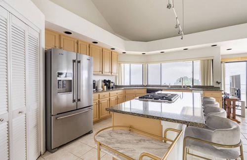 This stunning estate offers an unparalleled blend of comfort and luxury. From nearly every room, you’ll enjoy breathtaking panoramic ocean views, with a spacious lanai, deck, and an infinity pool overlooking the Kona coastline. Designed for both relaxation and entertainment, the home features two fully equipped gourmet kitchens, two inviting living rooms, and two elegant dining areas. A dedicated gym with high-end Life Fitness cardio machines allows you to stay active during your stay. High-speed commercial-grade WiFi (up to 600 Mbps) ensures seamless connectivity, whether for work or leisure. Every room is equipped with a split-system AC and heating for optimal comfort, while the cottage has AC in the bedroom. Laundry facilities are available in both suites, with an additional washer and dryer in the cottage. The estate also boasts an expansive parking area, making it perfect for large groups. Originally designed to accommodate two families vacationing together, this estate balances shared spaces with private retreats, offering a truly unique and luxurious getaway.