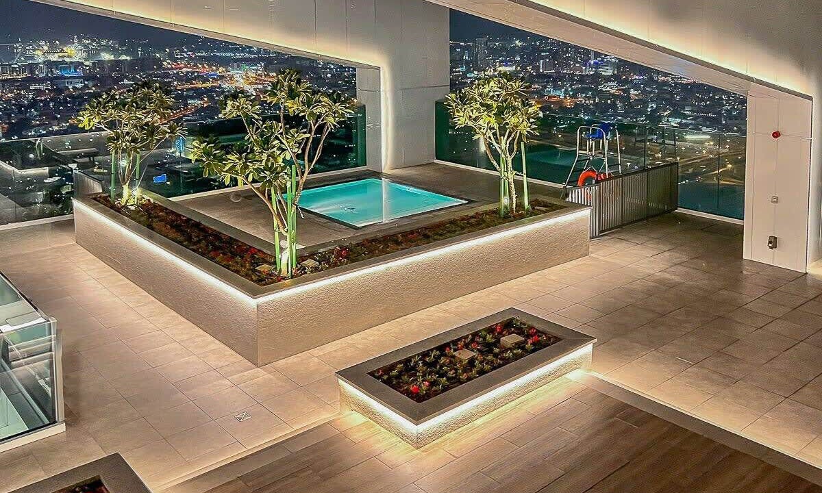 Next to it, is a bright contemporary-style living area. Sit back or lounge on the sofa set that will embrace the sophistication of modern living during your stay while watching your favourite TV shows over the console rack. The unique furniture and fixtures ooze are graceful and a great addition to the space.
